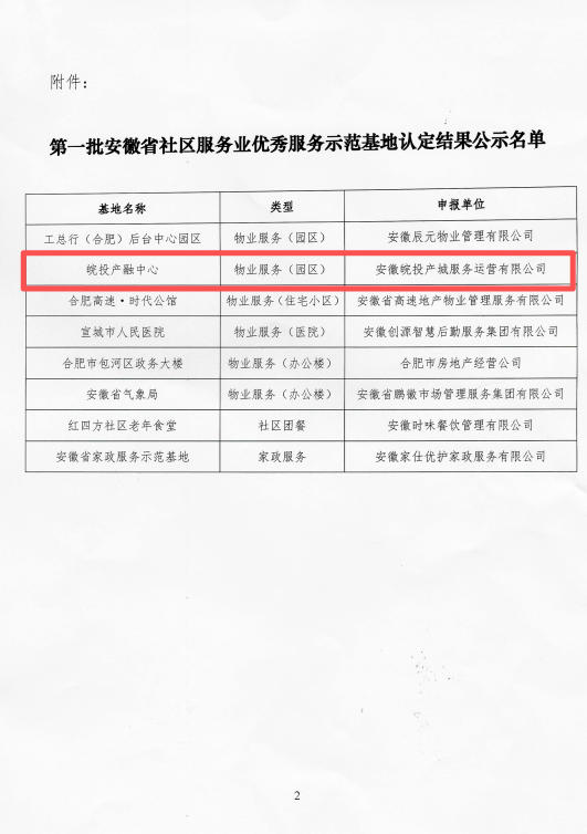 近日,由安徽省社区服务业协会和新安晚报社组织的安徽省社区服务业优秀服务示范基地评选中,皖投服务公司在管项目皖投·产融中心凭借产业服务、智慧化管理、多业态融合等领域的突出实践和优异表现荣获“第一批安徽省社区服务业优秀服务示范基地”。