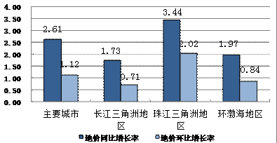 从同比增长率看,三大重点区域综合地价同比增速由五个季度连续放缓转为回升态势。其中,珠江三角洲地区增速最快,为3.44%,较上一季度上升了2.22个百分点,长江三角洲和环渤海地区增速分别为1.73%、1.97%,分别较上一季度上升了1.41和0.55个百分点。