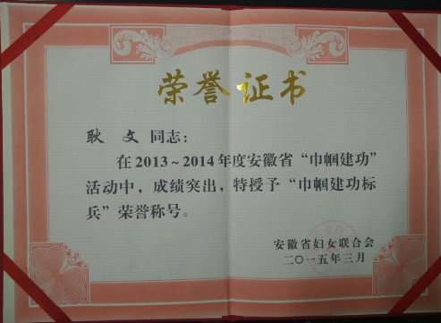 近日,安徽省妇女联合会传来喜讯,耿文同志在2013-2014年度安徽省“巾帼建功”活动中,成绩突出,被授予“巾帼建功标兵”荣誉称号。