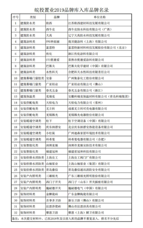 附件:皖投置业2019品牌库入库品牌名录