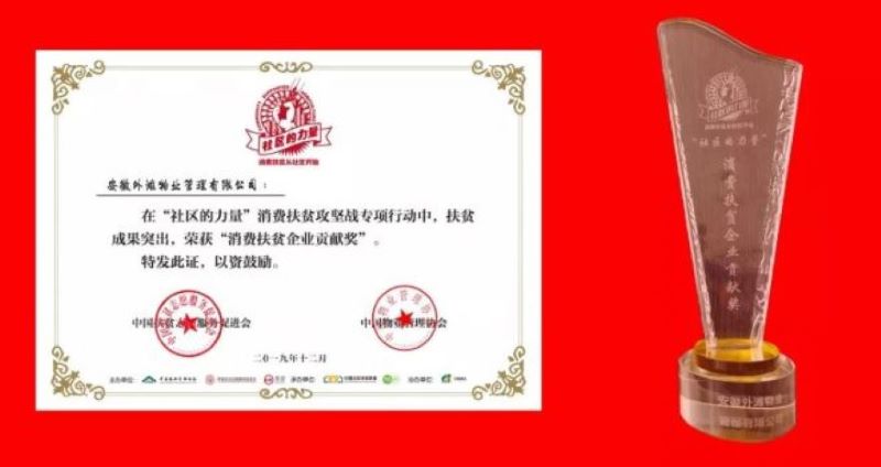 2019年12月11日,中国扶贫志愿服务促进会、中国物业管理协会指导,中国社区扶贫联盟主办,易居乐农承办的中国社区扶贫联盟第二届理事大会在京顺利召开。会议对“社区的力量消费扶贫攻坚战专项行动”阶段性的成果进行表彰,安徽外滩物业管理有限公司荣获“社区的力量”消费扶贫企业贡献奖,在其管理的皖投·天下名筑(合肥)、皖投·天下名筑(安庆)项目均获评“社区的力量”消费扶贫榜样社区。