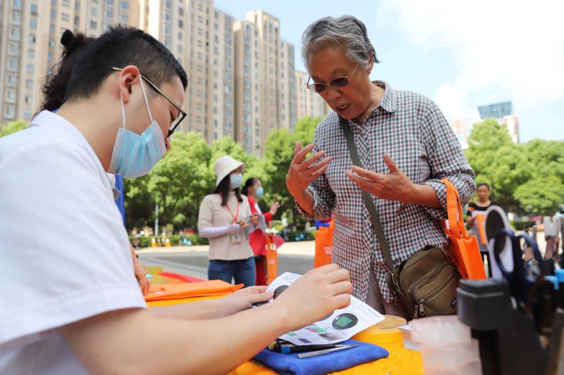 活动现场,望湖城沁心湖社居委与皖投服务公司党支部党员志愿者一起,向广大业主发放宣传资料,聘请眼科医护人员为业主讲解眼科知识,为业主清洗、修理眼镜。